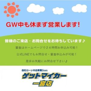 おはようございます! もうすぐGWですねっ💃 予定はお決まりですか?? GWにお車の買い替えどうですか?😊 ゲットマイカーは休まず営業しておりますので ご来店お待ちしております。